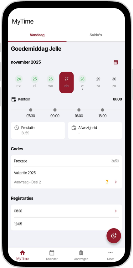 - Registraties aanmaken, consulteren en aanvragen (bijvoorbeeld indien vergeten tikken of bij thuiswerk)
